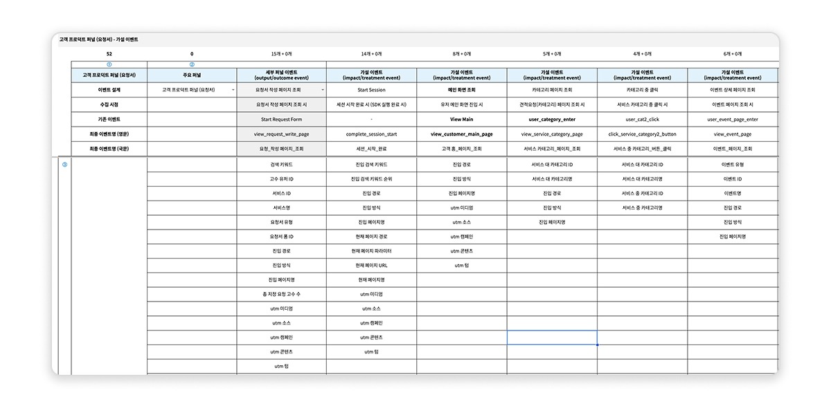 문제는 관리의 부재였어요. 같은 행동이라도 팀마다 다른 이벤트 명을 쓰거나 어떤 데이터는 수집되지 않는 경우도 있었죠. 이벤트가 중복되거나 정의가 애매해 실제 분석 단계에서 혼선이 많았던 것이죠.