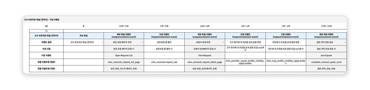 에이비일팔공 컨설팅팀과 함께 약 6주간 진행되었고, 숨고 서비스의 주요 퍼널을 중심으로 기존 이벤트와 프로퍼티를 전수 검토했어요.이 과정에서 중복 이벤트를 정리하고 명명 규칙과 정의를 통일하며 실제 서비스 환경에 맞게 단계별로 적용할 수 있는 구조로 재설계하여 전사가 함께 사용하는 데이터 거버넌스를 구축하게 되었어요.