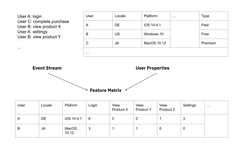 유저들의 선호도를 모델링하려면, 우선 해당 유저를 잘 표현할 수 있는 feature들을 선택해야 합니다. 마침 고객들은 Amplitude에 귀중한 데이터 소스를 제공하는데요. 바로 이러한 feature를 수집할 수 있는 유저 이벤트와 플랫폼 및 로케일(locale)과 같은 유저 속성(property)들입니다.