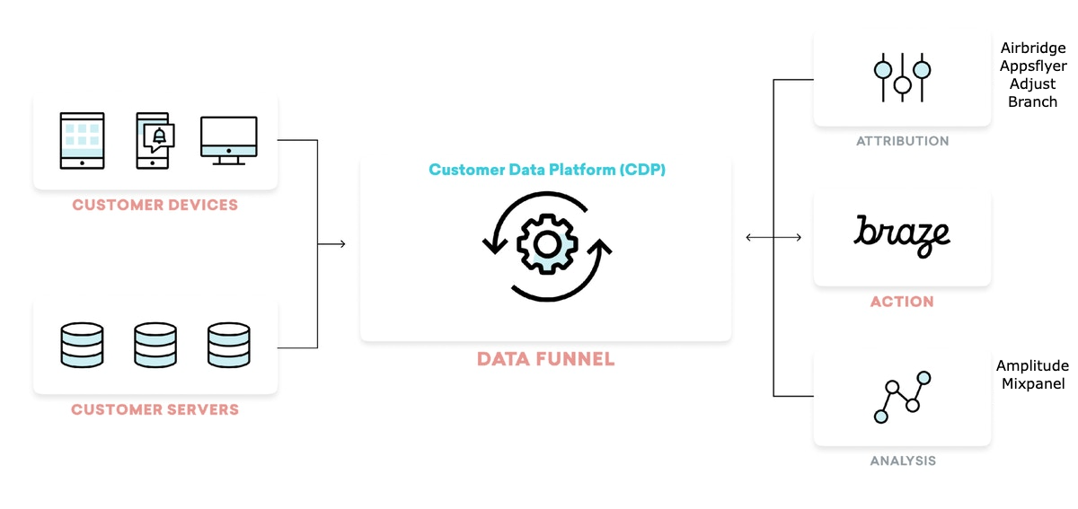 고객 데이터 플랫폼(CDP)은 마테크 스택 내에서 데이터 민첩성(data agility)을 향상시키고 지원합니다. 이 플랫폼을 통해 필요에 따라 브레이즈를 비롯한 다양한 솔루션들과 주요 데이터를 더 쉽게 주고받을 수 있습니다. 이 기술은 다양한 시스템 및 플랫폼과의 맞춤형 연동을 통해, CSV 가져오기와 같은 임시 데이터 수집 방식의 필요성을 줄이며 다른 마테크 스택에서 브레이즈로의 원활한 데이터 흐름을 지원합니다. 특히 브레이즈에서는 이 데이터를 고객 메시징 및 기타 브랜드 경험을 강화하는 데에 활용할 수 있죠. 브레이즈의 기술 파트너 CDP 솔루션들에는 Segment, Amperity, mParticle, Tealium 등이 있습니다.