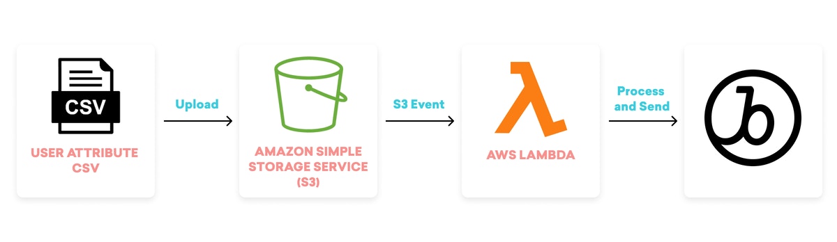 이 애플리케이션을 통해, 유저 속성이 포함된 100MB 이상의 CSV 파일을 S3 버킷에 업로드할 수 있습니다. 그리고 이는 Lambda에 대한 통신을 자동으로 트리거함으로써 애플리케이션의 코드를 활용하여 CSV 파일을 처리하고 Braze 플랫폼으로 전달할 수 있습니다. 이 애플리케이션은 대용량 CSV 파일 업로드와 관련된 수동적인 파일 준비 과정을 피하도록 도와주며, 프로세스를 보다 원활하고 만들고 자동화합니다. 하지만 그렇다고 해서 이 과정이 SDK나 API를 통해 데이터를 브레이즈에 전송하는 것만큼 마찰이 없는 것은 아니기 때문에, 브레이즈에 유저 속성을 전송해야할 때는 가능한 한 SDK나 API를 활용하는 것을 권장합니다.