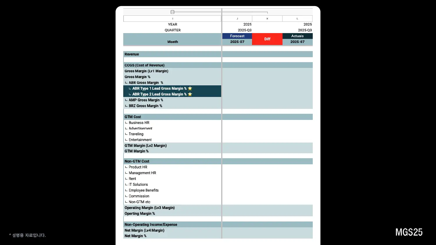 AB180에서는 재무 목표를 ‘목표와 현재 상태 사이의 갭을 줄이는 게임’으로 정의하고, 구글 시트로 가공된 데이터(매출, 매출원가, GTM, GTM 마진 등 SaaS 비즈니스 지표)를 리더 그룹이 슬랙을 통해 언제든 확인할 수 있도록 만들었습니다.