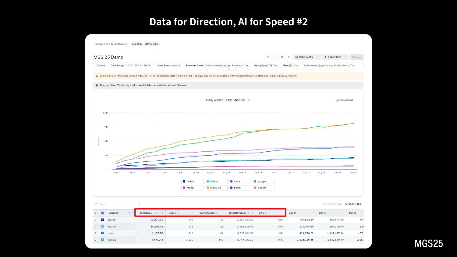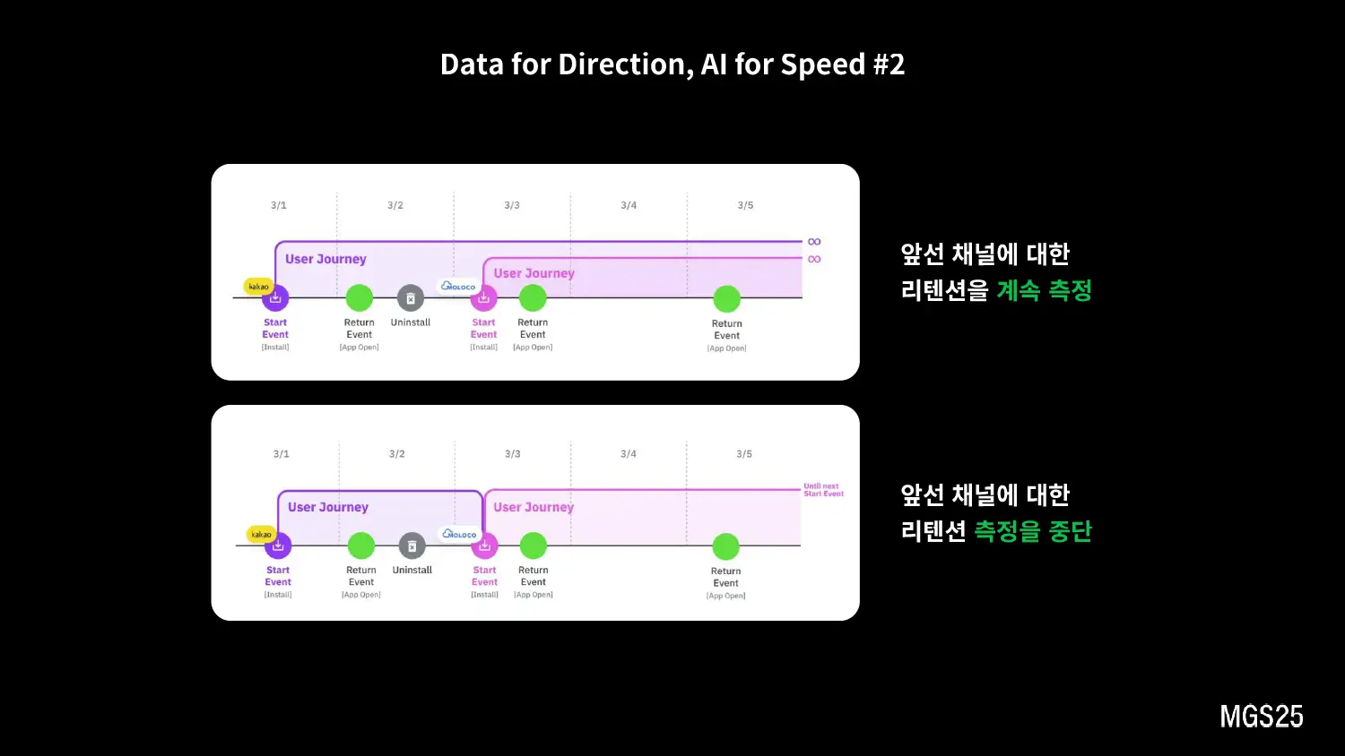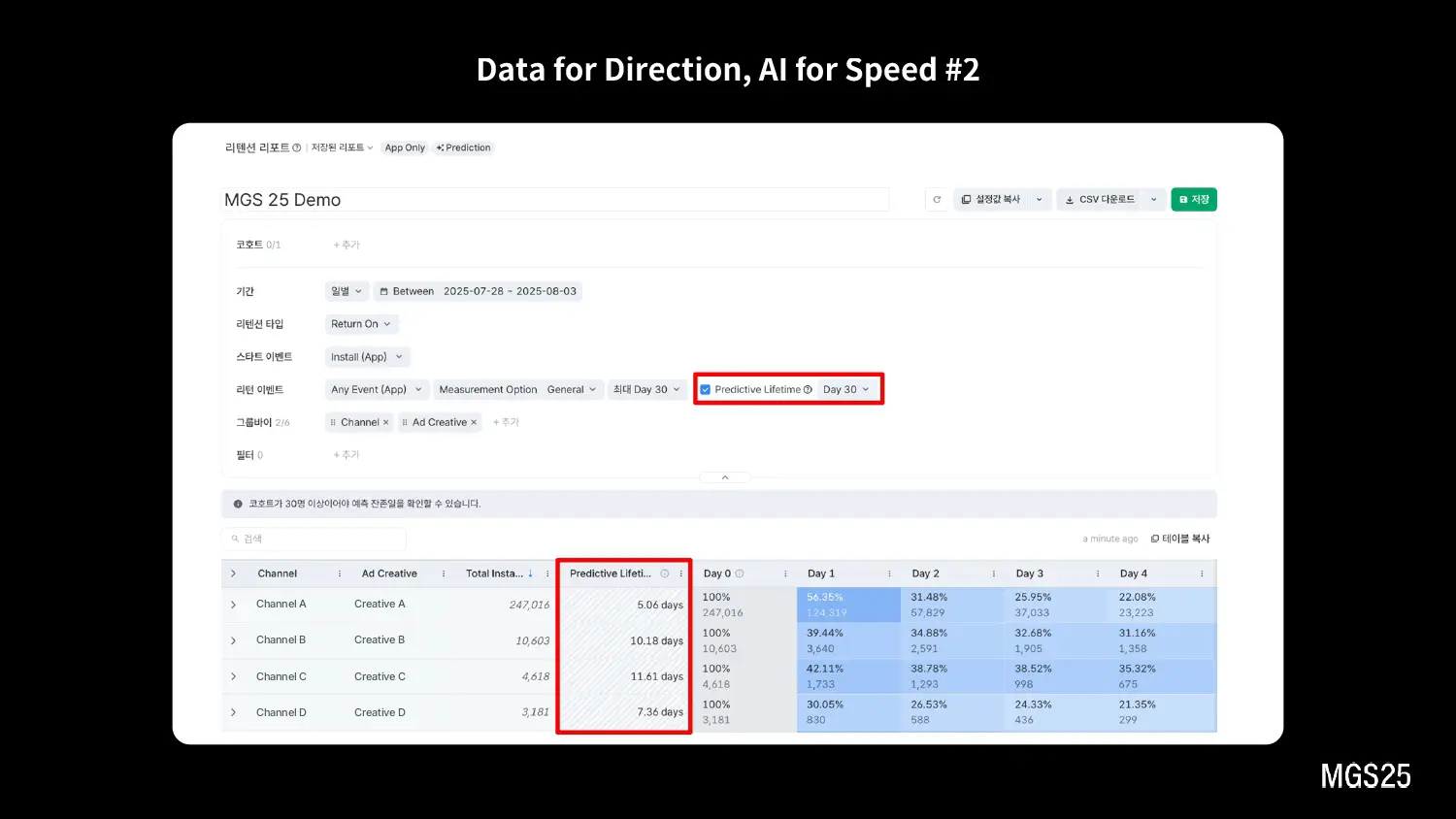 단순히 D1(Day 1 : 1일), D7, D30 같은 기간별 잔존율을 보는 것을 넘어, 채널·메시지별로 유입된 고객이 평생 동안 얼마나 잔존할지를 AI가 예측합니다. 단일 지표만으로도 어떤 유입이 가장 가치 있는지 직관적으로 파악할 수 있습니다.