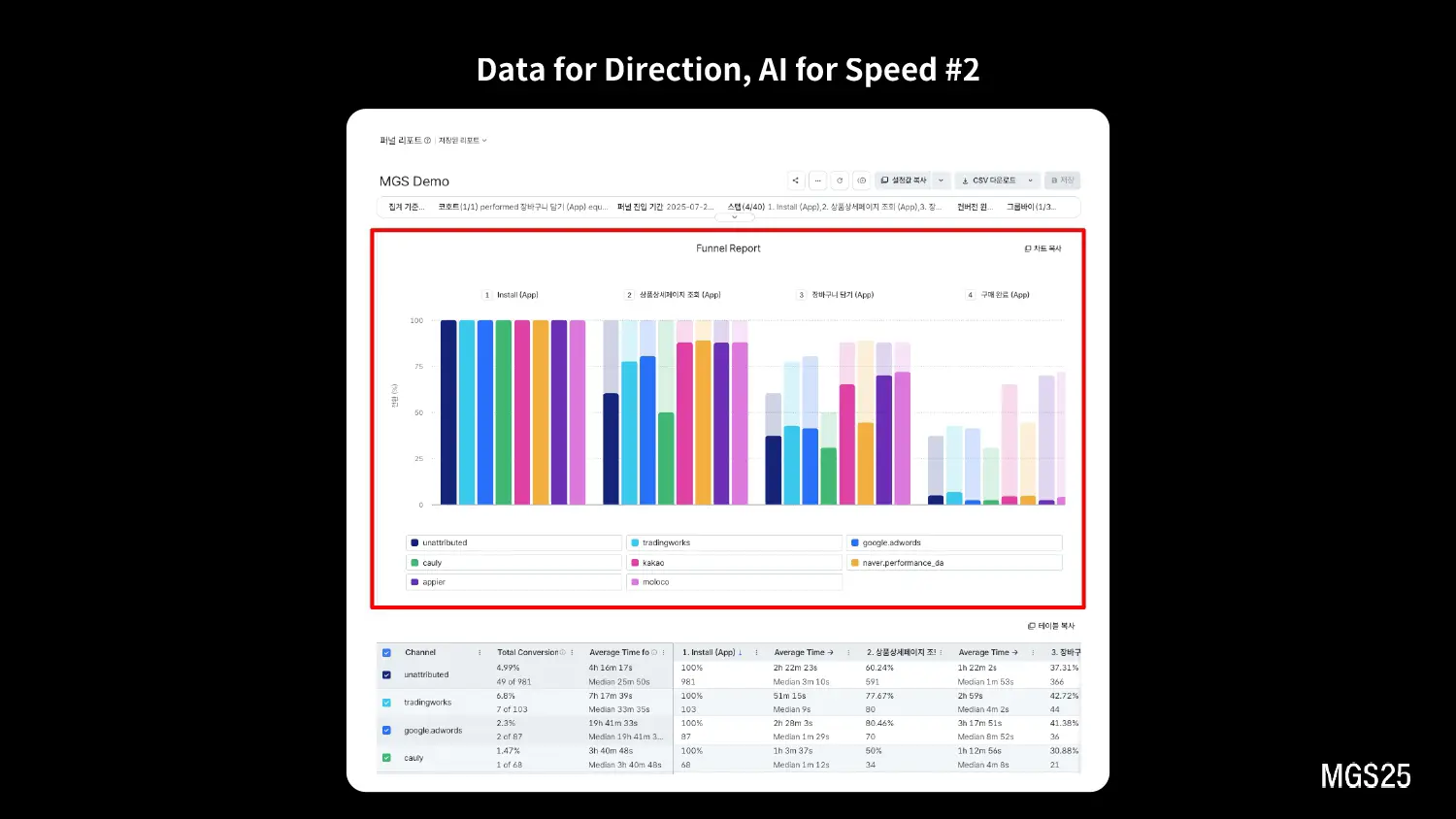 마지막으로 퍼널 리포트에서는 AI를 유입 채널 메시지 별로 설치하면 구매까지 단계별로 전환율을 확인할 수 있습니다. 당연히 시간이 짧았던 부분이 좀 더 유의미한 유입이라고 해석할 수 있죠.