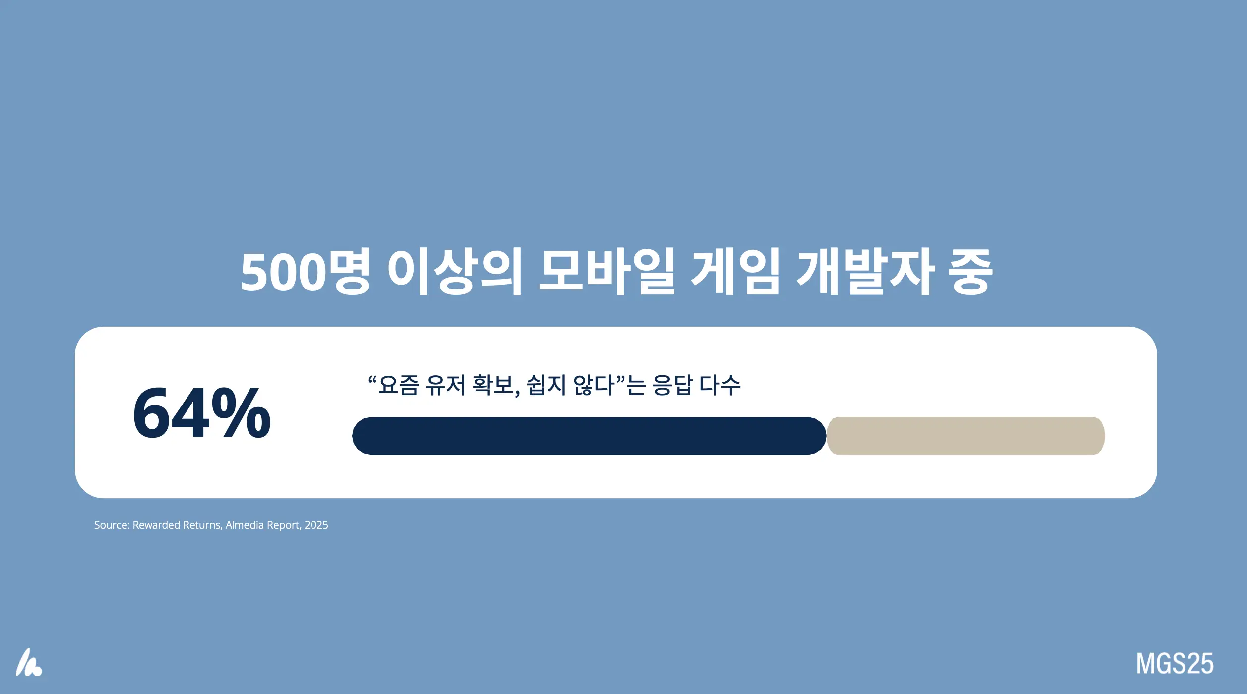 실제 알미디아에서는 500명 이상의 모바일 게임 개발자를 대상으로 현재 UA환경을 조사했을 때, 64% 이상이 현재 UA 환경을 “도전적이고 어렵다”라고 답했습니다. 환경은 급격히 변하고 있고, 경쟁은 치열해지고 있으며, 무엇보다 유저들의 기대치가 폭발적으로 높아졌기 때문이죠.