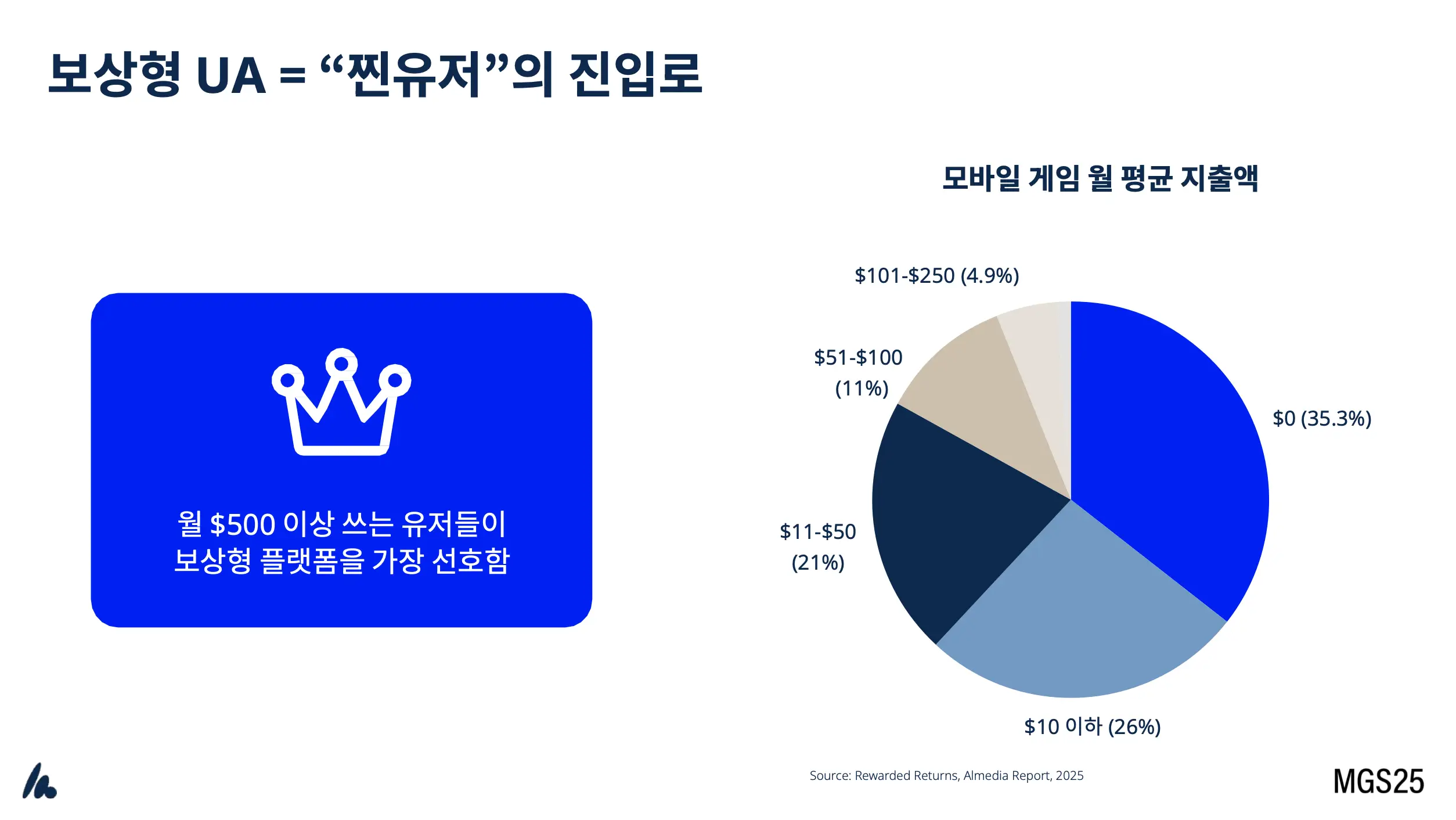 하지만 내부 조사에 따르면, 85%의 사용자가 보상을 받은 이후에도 계속 플랫폼에 머문다고 답했습니다. 즉, 보상형 UA는 단순히 설치와 유입을 늘리는 데서 그치지 않고, 지속적인 리텐션과 수익화까지 연결되는 전략까지 자리 잡고 있다는 것을 알 수 있습니다.