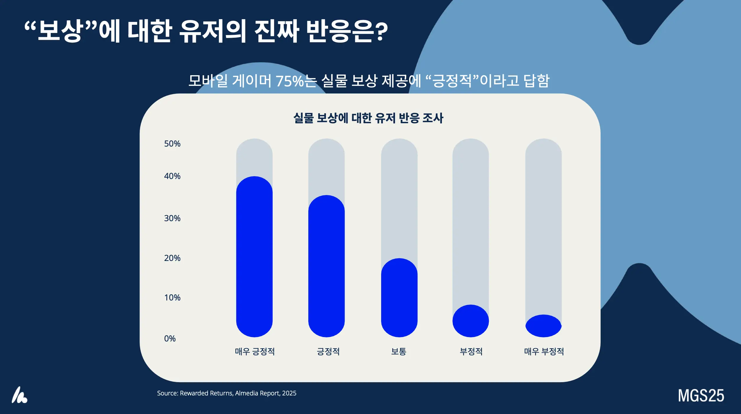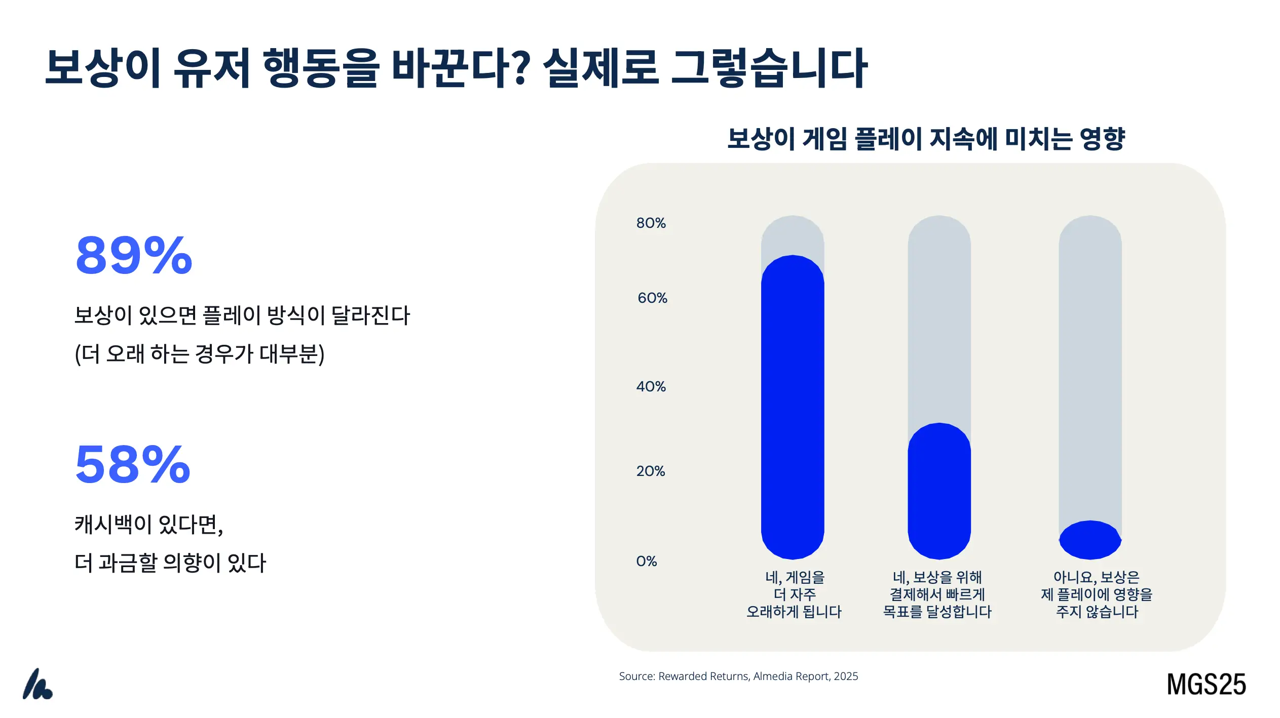 또한 89%의 유저는 “보상이 있으면 게임을 더 오래 플레이한다”라고 답했고, 58%는 캐시백이 있을 경우 추가 과금 결제 의향을 보였습니다. 더 나아가 모바일 사용자의 75%는 실물 보상 제공에 긍정적이라고 답했어요.