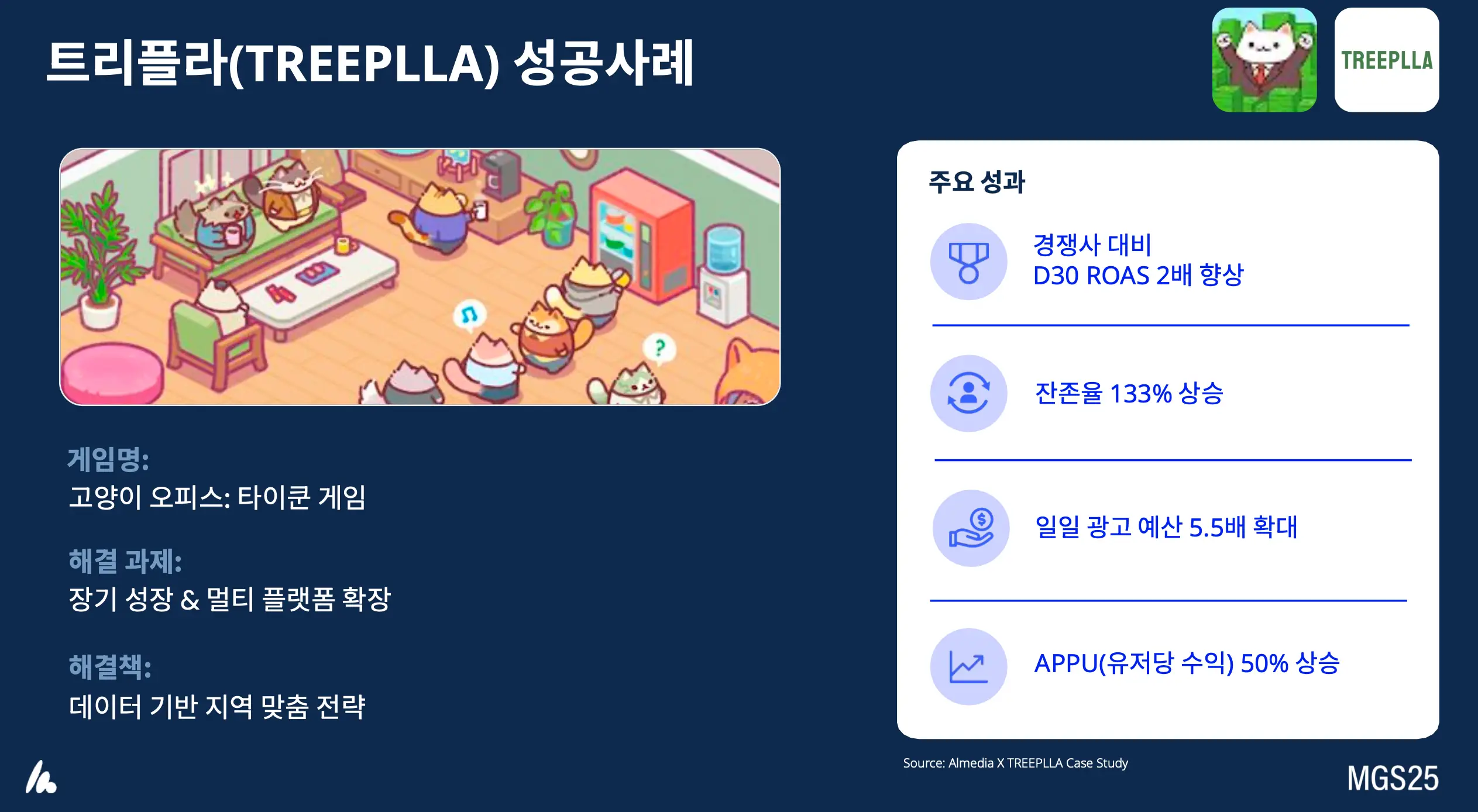 트리플라(TREEPLLA)가 운영하는의 '고양이 오피스: 타이쿤 게임'은 알미디아(Almedia)와 함께 보상형 UA 전략을 리뉴얼하여 알미디아의 플랫폼 프리캐시에 와 함께 보상형 UA 전략을 리뉴얼, 재론칭했고, 다음과 같은 놀라운 성과를 달성했습니다.