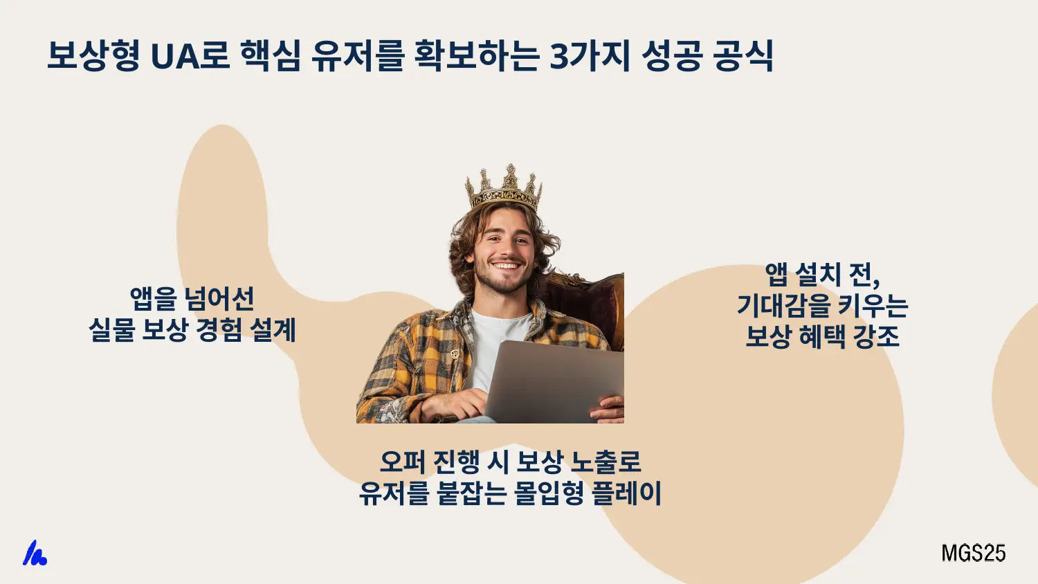 보상형 UA가 얼마나 좋은지 알았다면 이제 설계를 할 수 있어야겠죠. 보상형 UA의 원칙을 잘 반영한 캠페인의 3가지 성공 공식을 소개해 드리겠습니다.