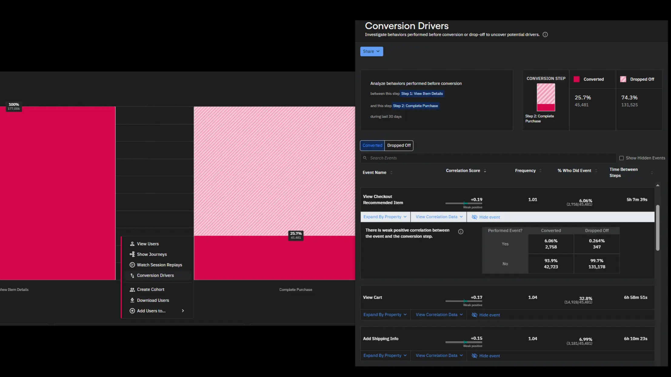 이미 오랫동안 사랑받고 있는 ‘Conversion Drivers’ 기능입니다. 이는 퍼널의 두 단계 사이에서 어떤 행동이 전환과의 상관관계가 높은지를 보여주는 기능이죠. 전환 간 주요 동인에 대해 많은 인사이트를 주는 기능으로 퍼널의 전환율을 확인하는 데 유용합니다.