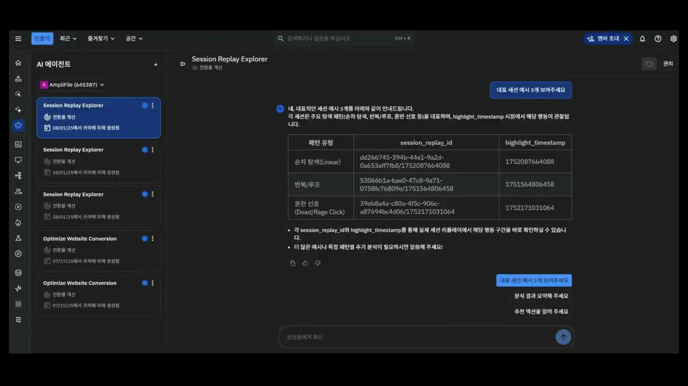 수 만, 수십 만, 수천 만 개의 세션이 쌓이면 그걸 사람이 다 볼 수 있을까요? 현실적으로 불가능합니다. AI가 대표적인 몇 가지 세션만 추려 보여주고, 문제까지 짚어주면 굉장히 편리하겠죠. 더 나아가 어떤 실험을 하면 좋을지 제안하고, 세팅까지 도와준다면 훨씬 수월할 겁니다.