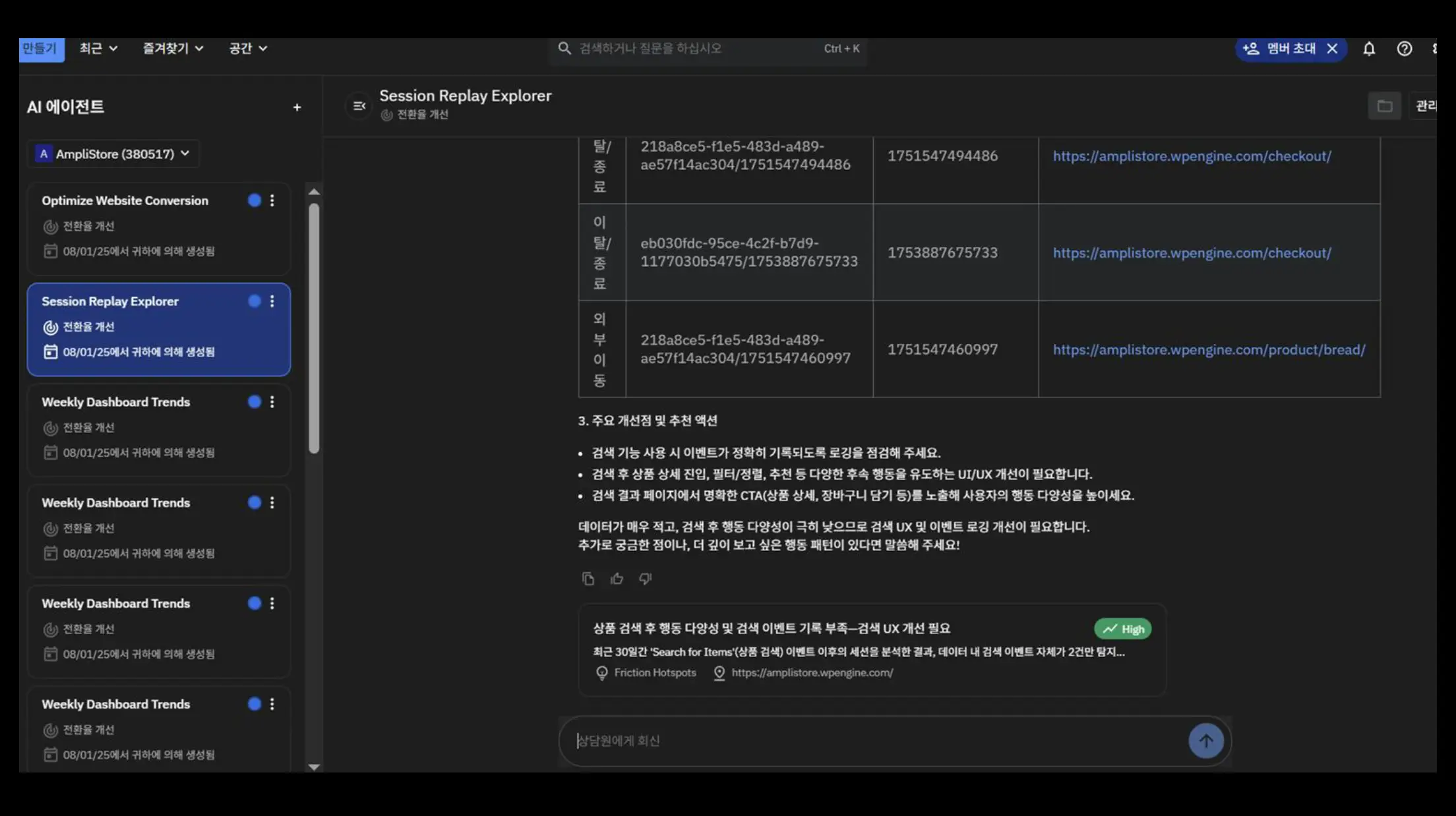 또한 단순히 차트를 보여주는 데 그치지 않고, "이 구간의 이탈률이 높은 이유를 더 알아볼까요?", "최근 한 달 기준으로 다시 분석해드릴까요?" 같은 후속 질문을 제안하며 분석 흐름을 끊김 없이 이어갈 수 있도록 도와줍니다.