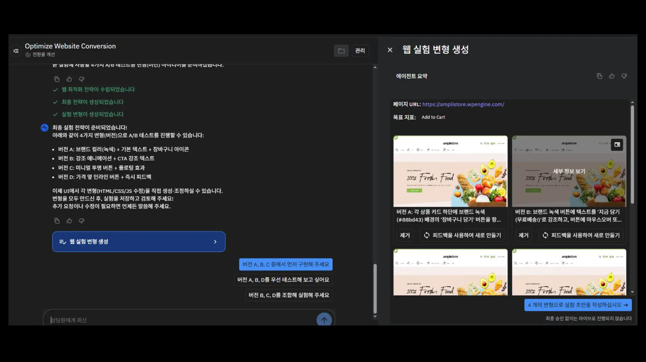 덕분에 데이터 해석, 인사이트 도출, 실험 설계 등 일련의 루틴이 하나의 맥락 안에서 이어지게 됩니다. 한 가지 유형에 머물지 않고, 특정 목적(예: 전환, 유지, 리텐션 등)에 맞춰 여러 종류의 에이전트가 구성될 수 있어, 기업의 다양한 목표에 맞게 유연하게 대응할 수 있습니다.