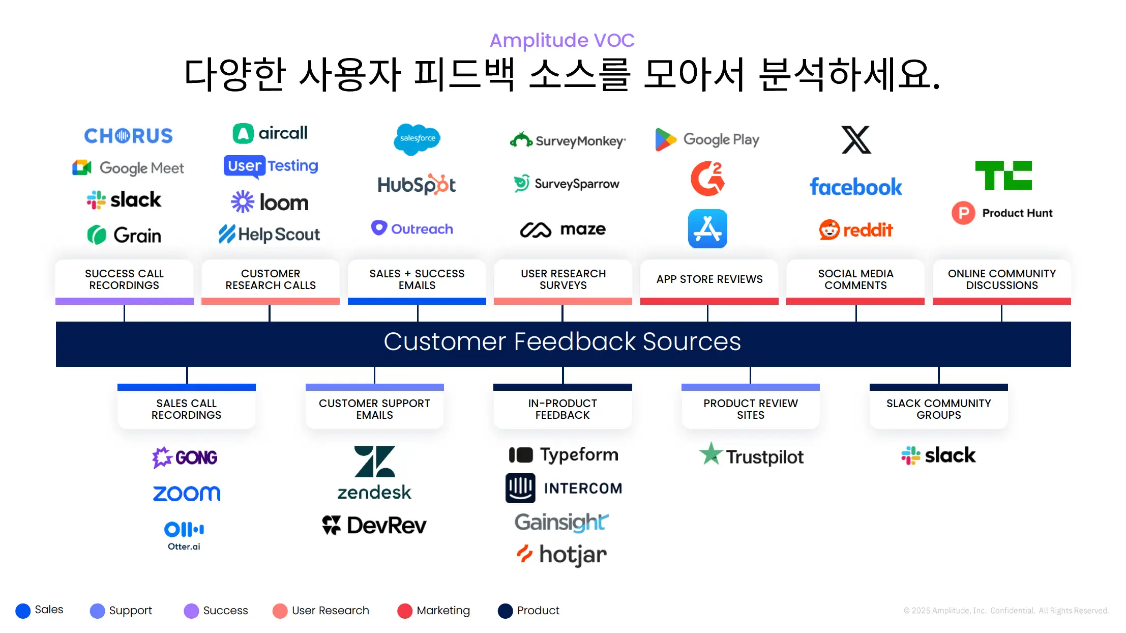 젠데스크, 구글 플레이스토어, iOS 앱스토어, 엑스(X, 구 트위터), 페이스북 등 다양한 채널에 흩어져 있는 고객 리뷰와 의견을 수집해, 앰플리튜드 안에서 행동 데이터와 통합 분석할 수 있습니다.