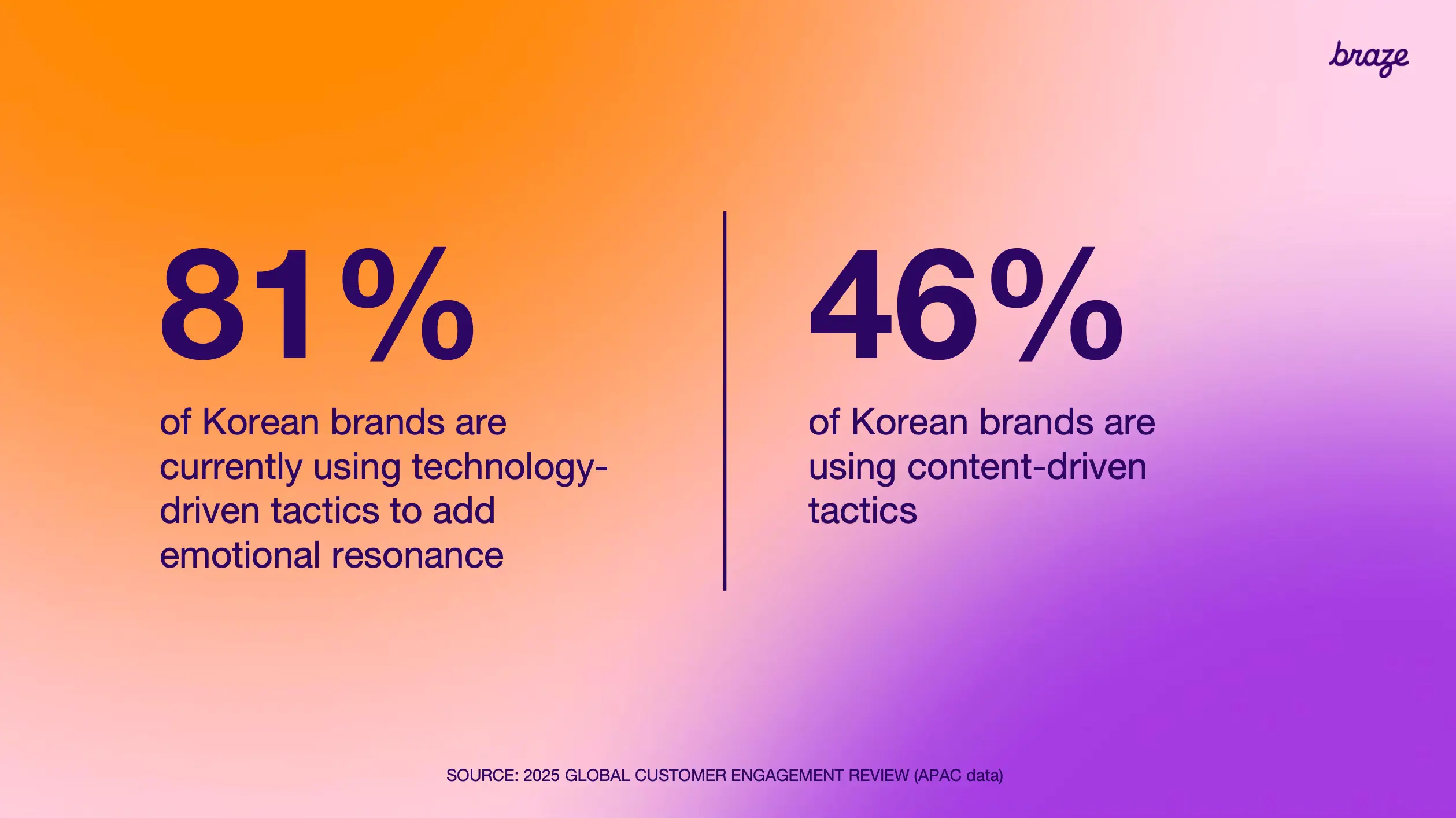 데이터를 살펴보면 기술 기반 감성 마케팅(technology-driven tactics to add emotional resonance)을 활용한다고 답한 비율이 APAC 전체는 93%인 반면, 한국은 81%였습니다. 또한 콘텐츠 기반 마케팅(content-driven tactics) 활용 비율은 한국은 46%에 그친 반면, APAC은 무려 93%에 달했습니다.