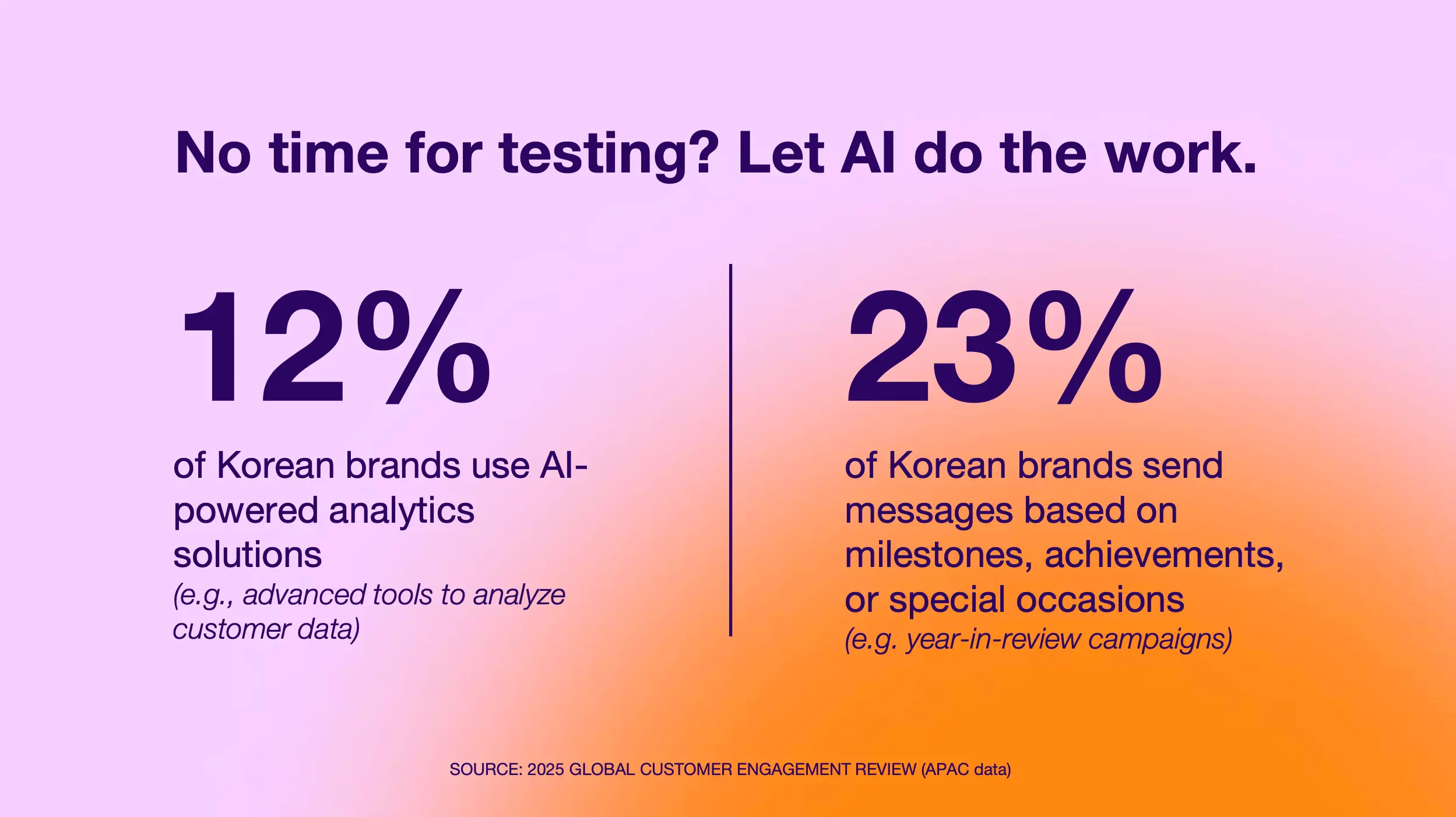 이는 많은 한국 브랜드가 여전히 고객 데이터 분석이나 세분화, 추천 모델링 등 핵심 CRM 영역에 AI를 충분히 통합하지 못하고 있음을 보여줍니다. 또한 한국 브랜드 중 23%만이 성과·특별한 기념일(예: 연말 회고 캠페인) 등에 맞춰 메시지를 발송하고 있어, AI 기반 개인화 여정은 아직 초기 단계에 머물러 있다는 것을 알 수 있습니다.