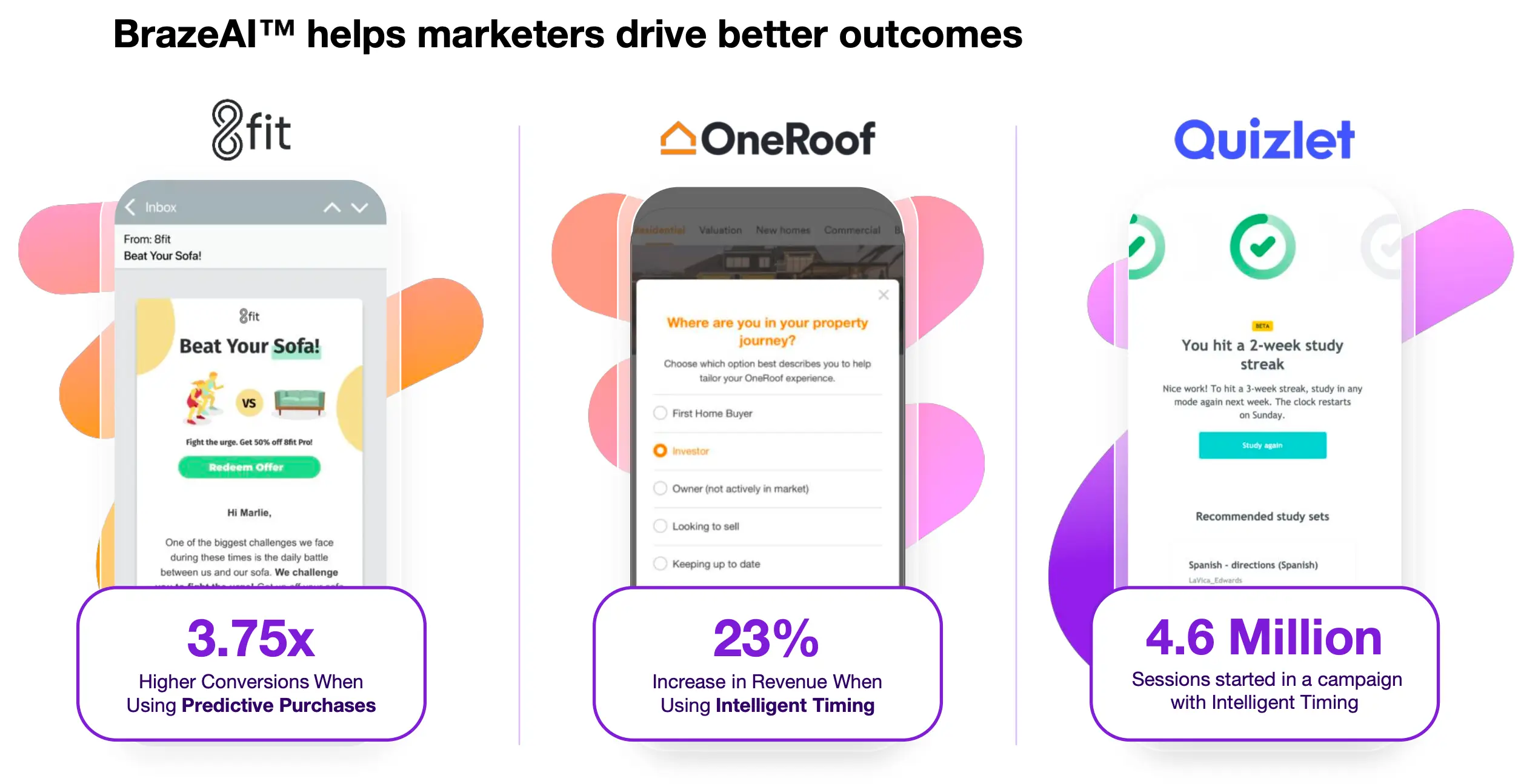 뉴질랜드에 기반을 둔 부동산 플랫폼 ‘OneRoof’와 낱말카드, 학습 솔루션 ‘Quizlet’은 지능형 타이밍(Intellighent Timing)을 활용하여 23% 매출 증가와 46만 세션 시작이라는 성과를 거뒀습니다.