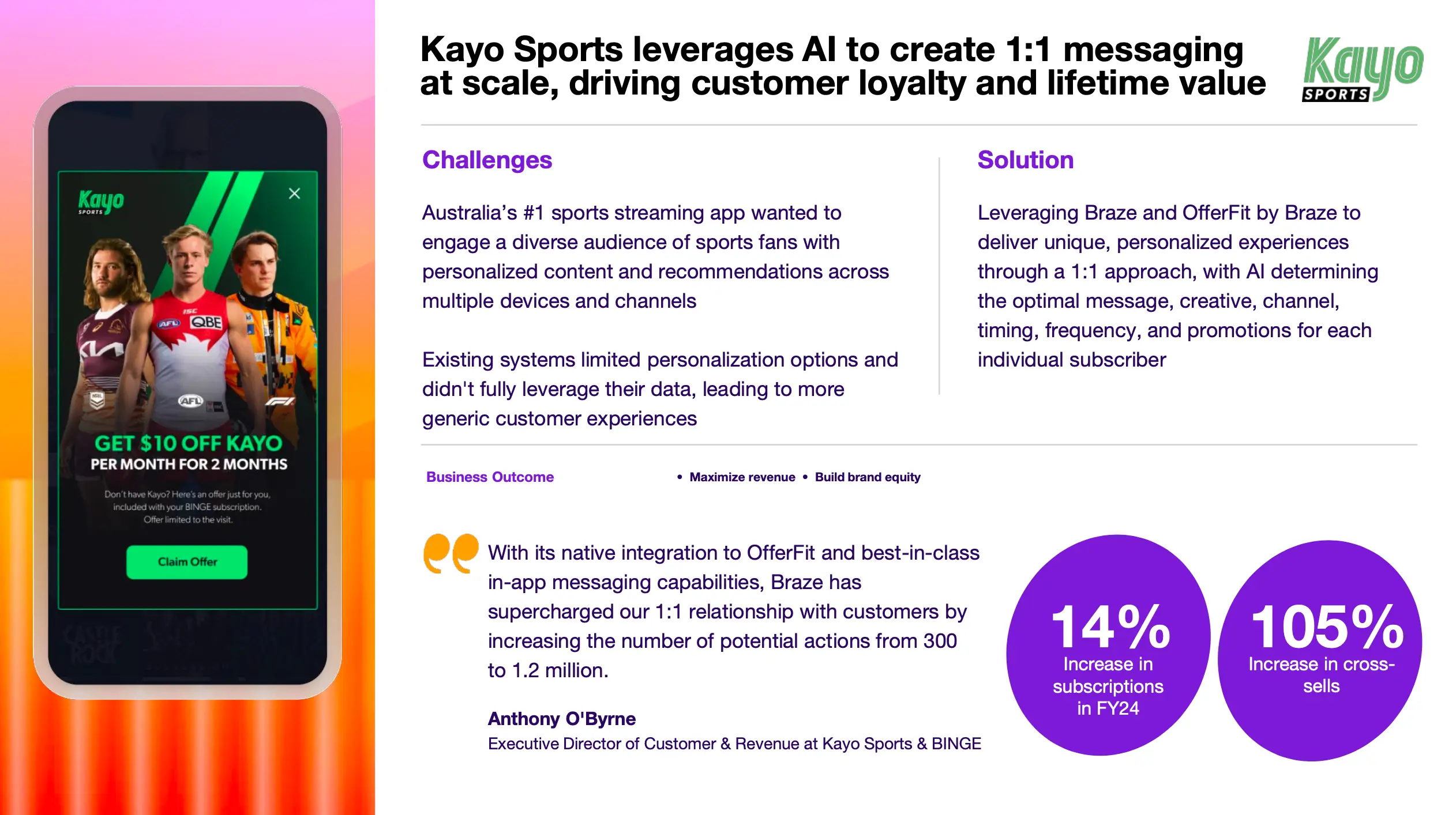 이에 브레이즈의 AI 기반 초개인화 1:1 메시지 기능 ‘OfferFit’를 도입해 개인별 인앱 메시지, 소재, 채널, 발송시점, 발송 시점 등을 결정하여 1:1 맞춤형 경험을 제공했습니다. 그 결과, 구독자 14% 증가, 교차판매(cross-sells) 105% 향상이라는 성과를 거두었습니다.