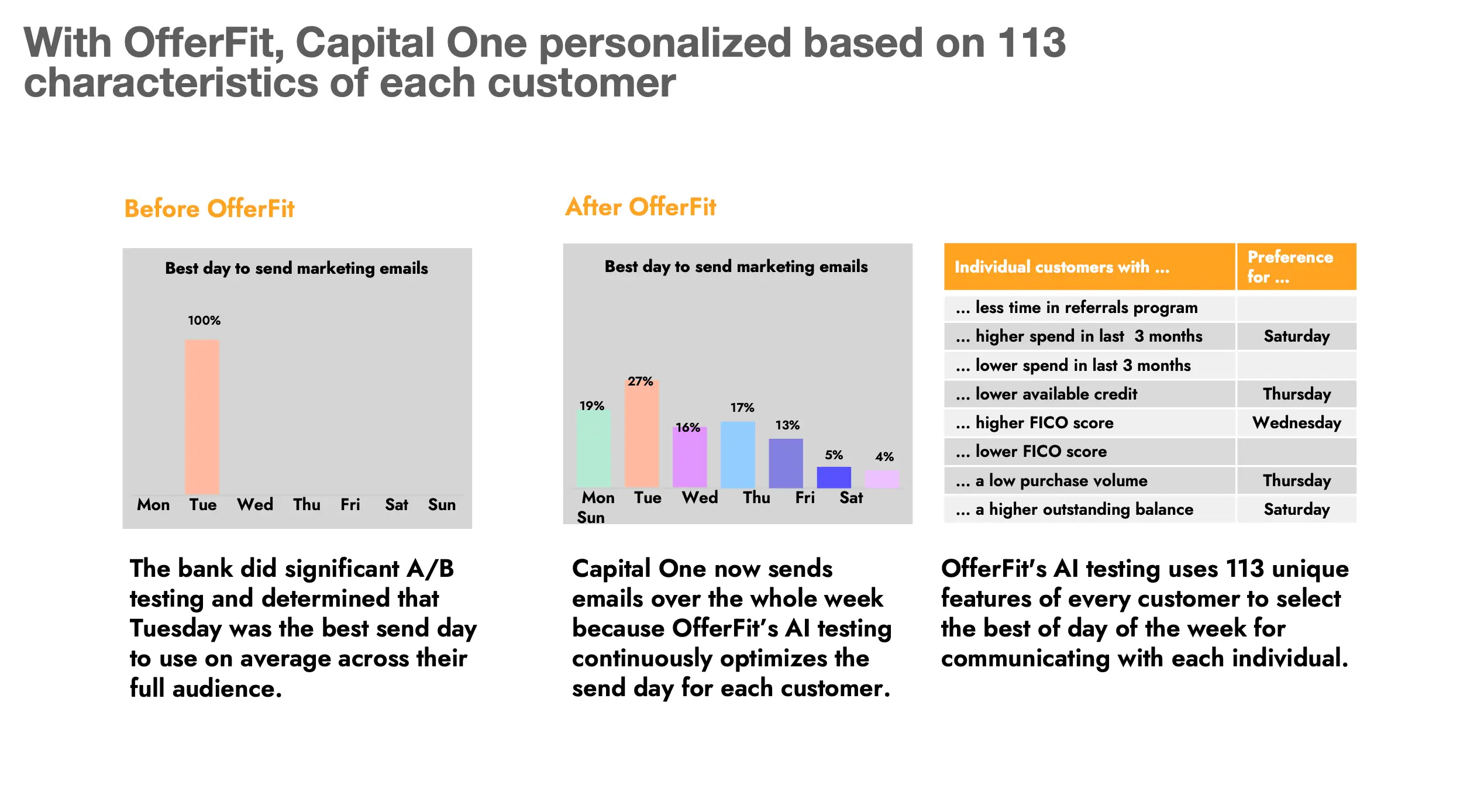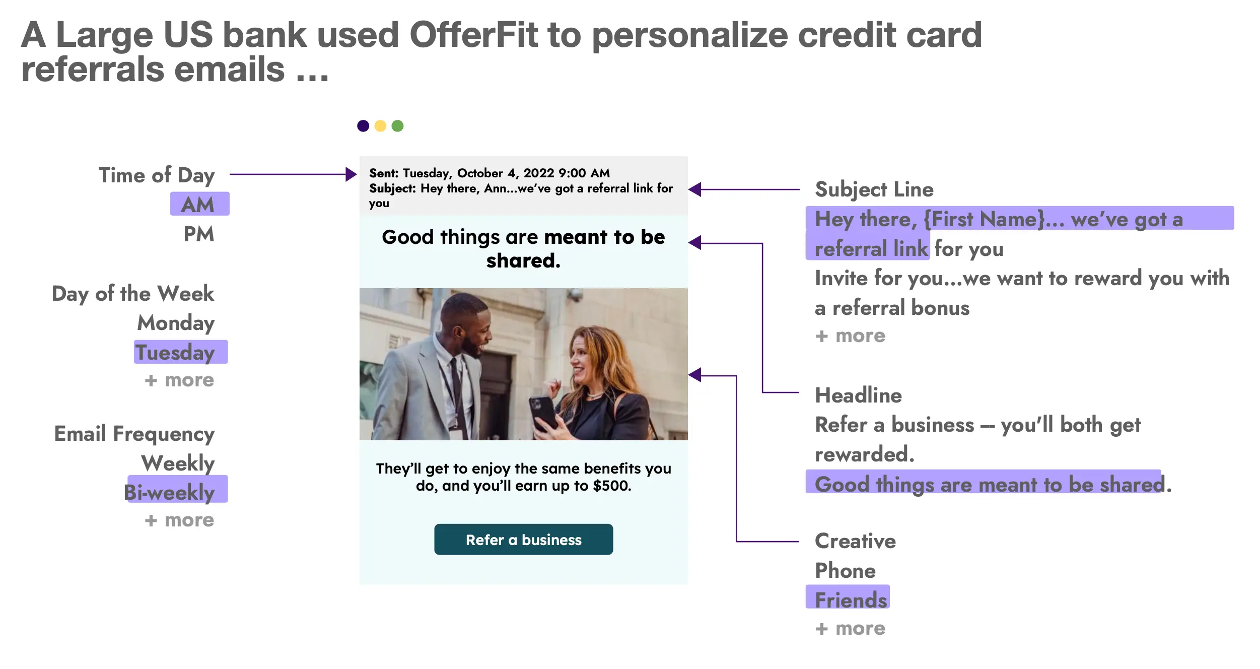 미국의 한 대형 은행은 ‘기존 고객 추천을 통한 신규 고객 유치(Referrals)’를 얻기 위해 AI를 도입했습니다. 이메일 발송 요일, 빈도, 제목, 메시지 유형 등 35,000가지 변수와 고객별 130개 속성을 모두 고려해야 하다 보니 사람이 직접 최적화하기엔 불가능했죠.