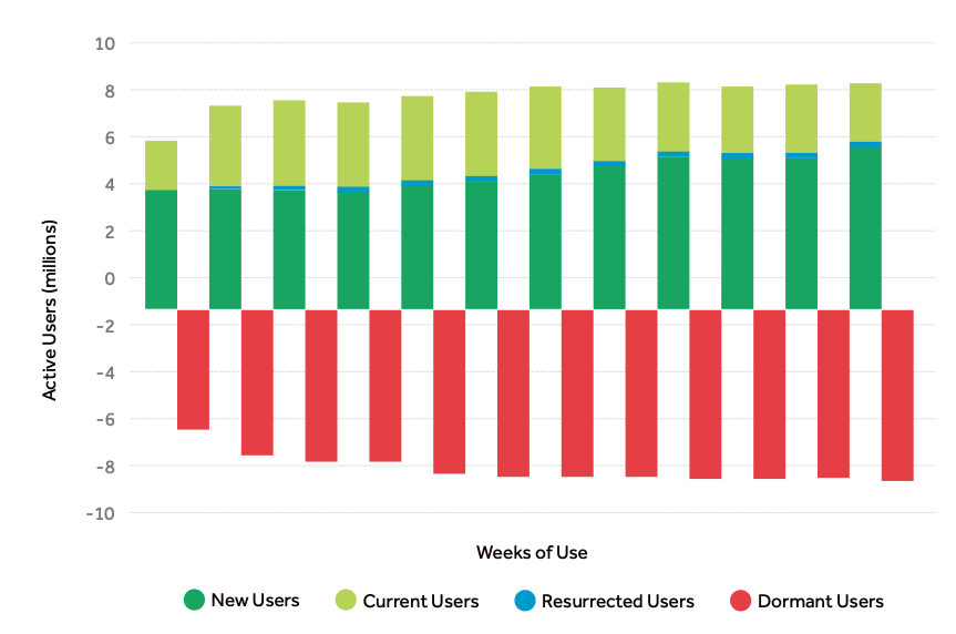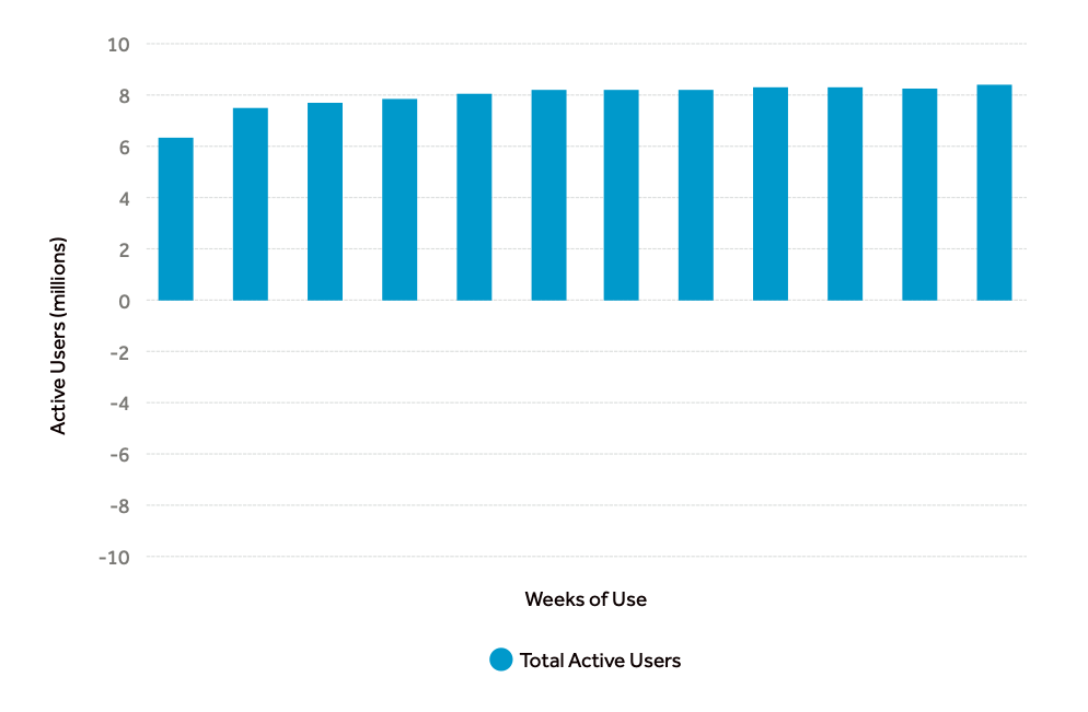 아래의 바 그래프는 특정 제품의 12주 동안 총 액티브 유저 수를 표시한 것입니다. 이 제품은 12주에 걸쳐 600만 액티브 유저에서 800만 이상으로 액티브 유저 수가 늘어났습니다. 언뜻 보면 잘 성장하고 있는 것처럼 보입니다.
