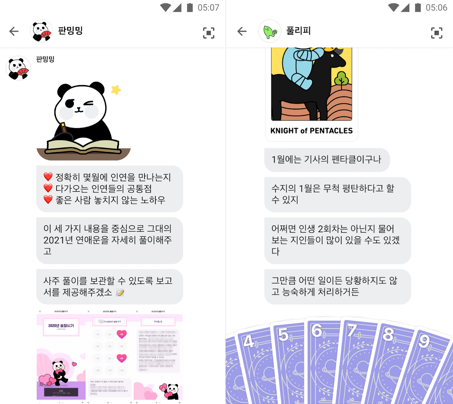 헬로우봇은 챗봇을 통해 ‘친구’와 같이 편안하게 상담을 하고 이야기를 할 수 있다는 점이 가장 큰 차별점입니다. 타로를 전문적으로 보는 타로 마스터나 선생님 같은 느낌이 아닌, 나와 아주 친한데 타로도 잘 보는 친구와 이야기를 하는 느낌이 중요합니다. 가르치기보다는 공감하는 거죠. 예를 들어서, ’나 만나던 사람이랑 헤어져서 너무 힘든데 다시 만날까'라고 물으면, 진짜 친구처럼 같이 심란해하고 공감하면서 고민해 주는 식입니다. 타로는 대화를 통해 공감하고 위로하는 도구로 기능하는 것이지 정답을 알려주는 것은 아닙니다.