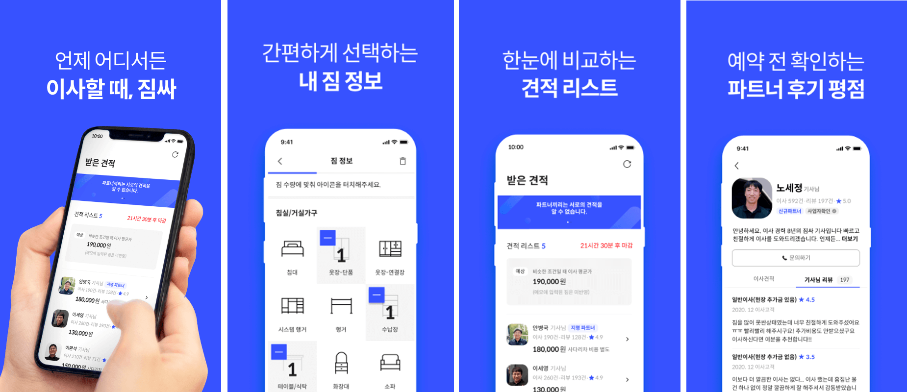 최: 짐싸는 고객과 파트너를 연결해주는 O2O 플랫폼입니다. 우선 이사를 희망하시는 고객분들이 저희 앱 내에서 짐 정보, 지역 및 날짜 등 이사 관련 정보를 입력해 주시면, 저희 파트너분들이 가격 정보가 담긴 견적서를 전달합니다. 현재는 지명 견적을 포함해 한번에 최대 9개의 견적서를 받을 수 있어요. 이후 고객 분들은 기사님들의 정보, 평점, 후기, 제안한 가격 등을 바탕으로 비교해서 기사님을 선택하여 이사를 하는 과정으로 진행됩니다.